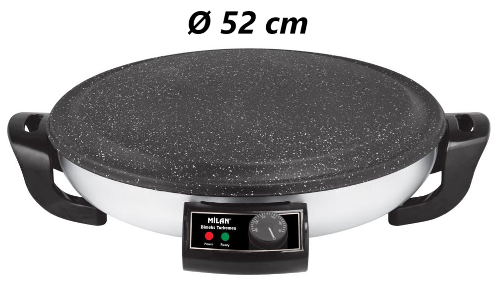 Der Bimeks Fladenbäcker Milan ist ein leistungsstarkes Gerät zum Backen und Braten auf großer Fläche. Mit einem Durchmesser von 52 cm bietet er reichlich Platz für Fladenbrot, Pide, Lahmacun, Pfannengerichte oder süße Teigspeisen – perfekt für große Haushalte oder besondere Anlässe.